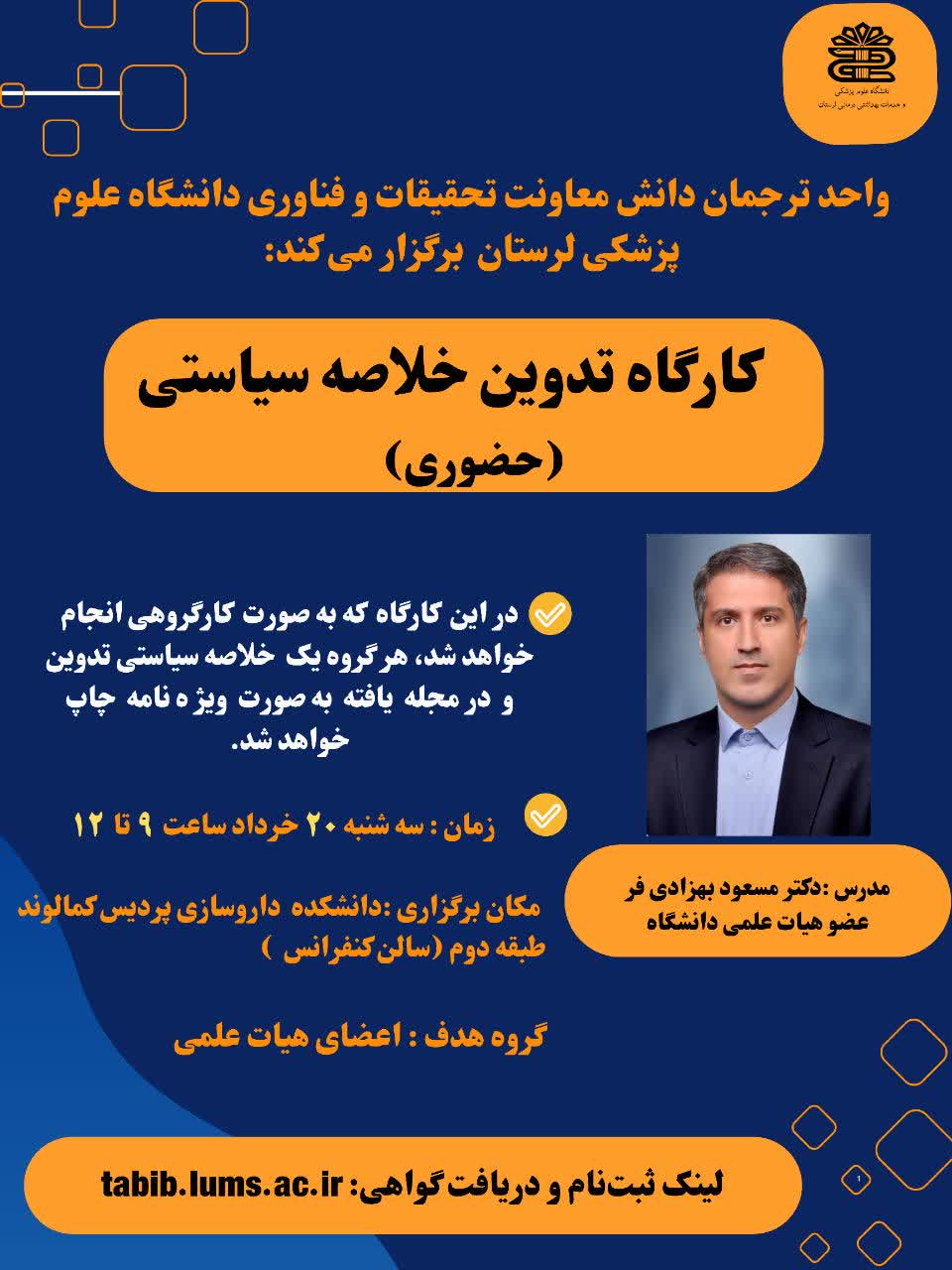 2  کارگاه تدوین خلاصه سیاستی(حضوری) (انجام کارگروهی) آقای دکتر مسعود بهزادی فر 1403/03/20